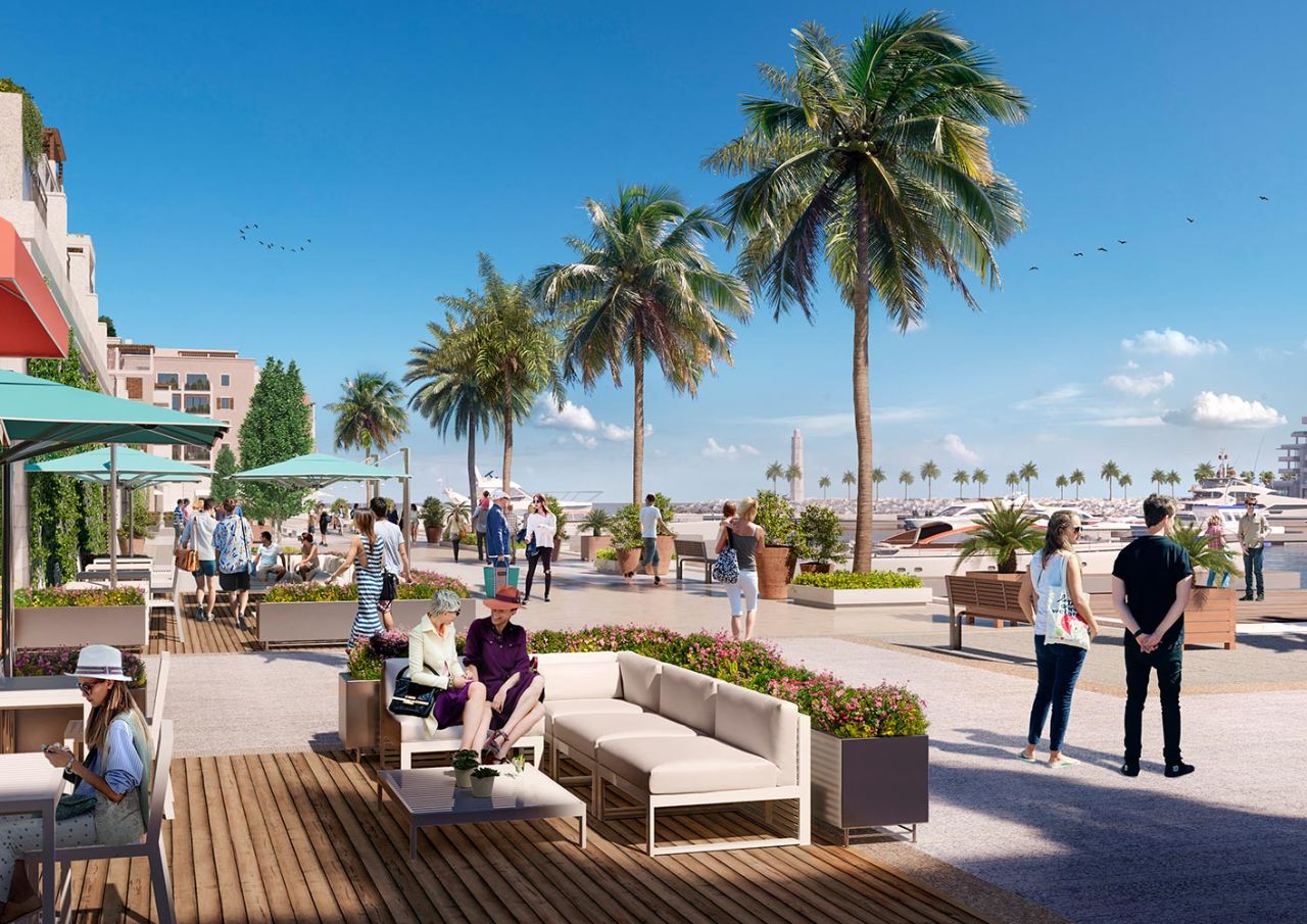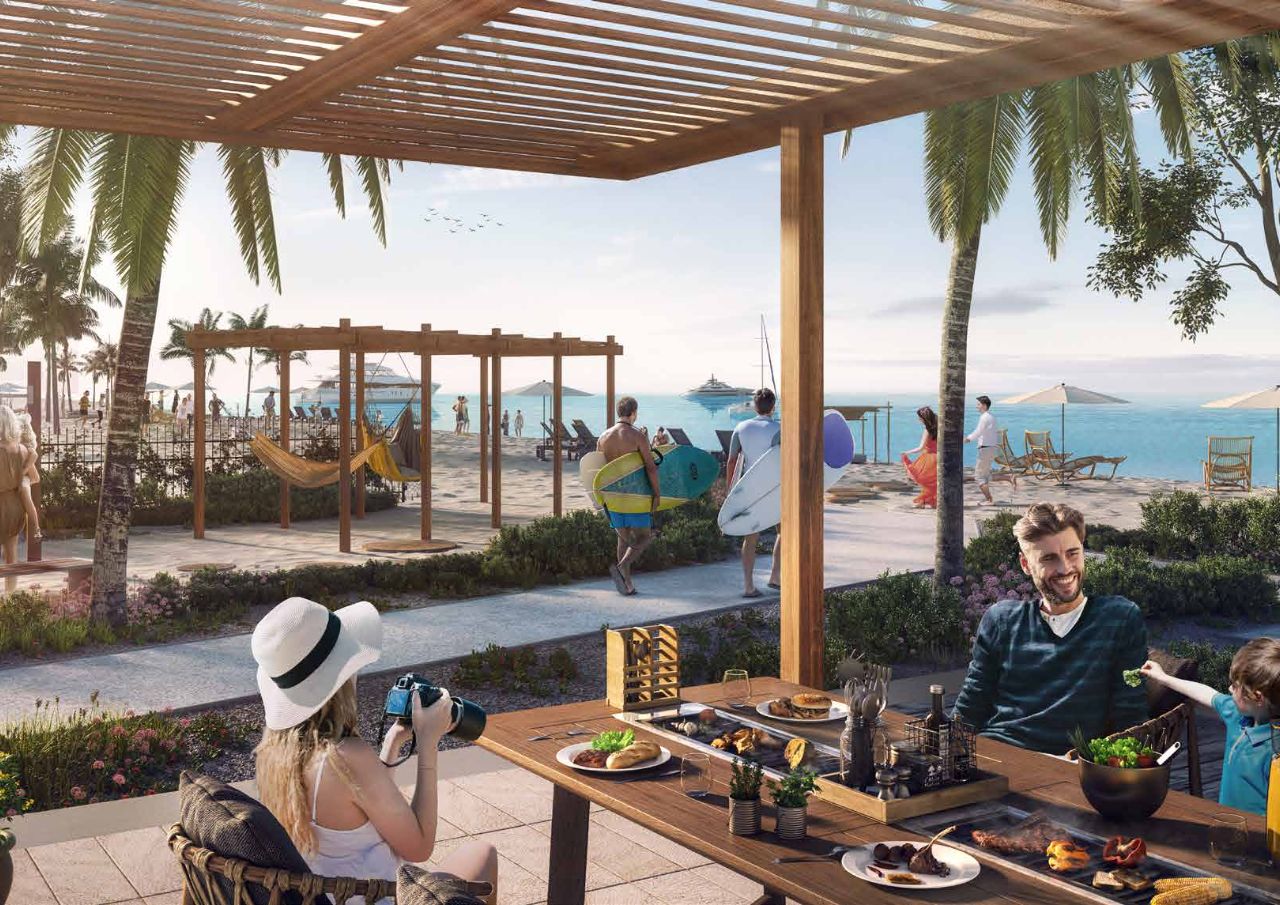 The development includes amenities such as BBQ areas, beach access, beach volleyball, fitness center, marina & yacht club, mosque, shopping mall, sports court, and water activities.
